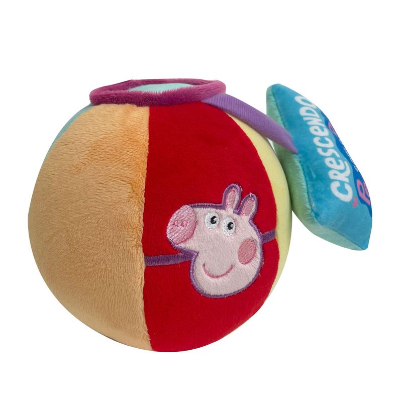 • Bola em pelúcia com cores diferentes em cada lado, vem com um guizo que faz som ao chacoalhar. Possui uma almofadinha da Peppa na versão baby que emite som ao apertar e o logo bordado. Vem com argola para pendurar no carrinho, berço ou bebê conforto.