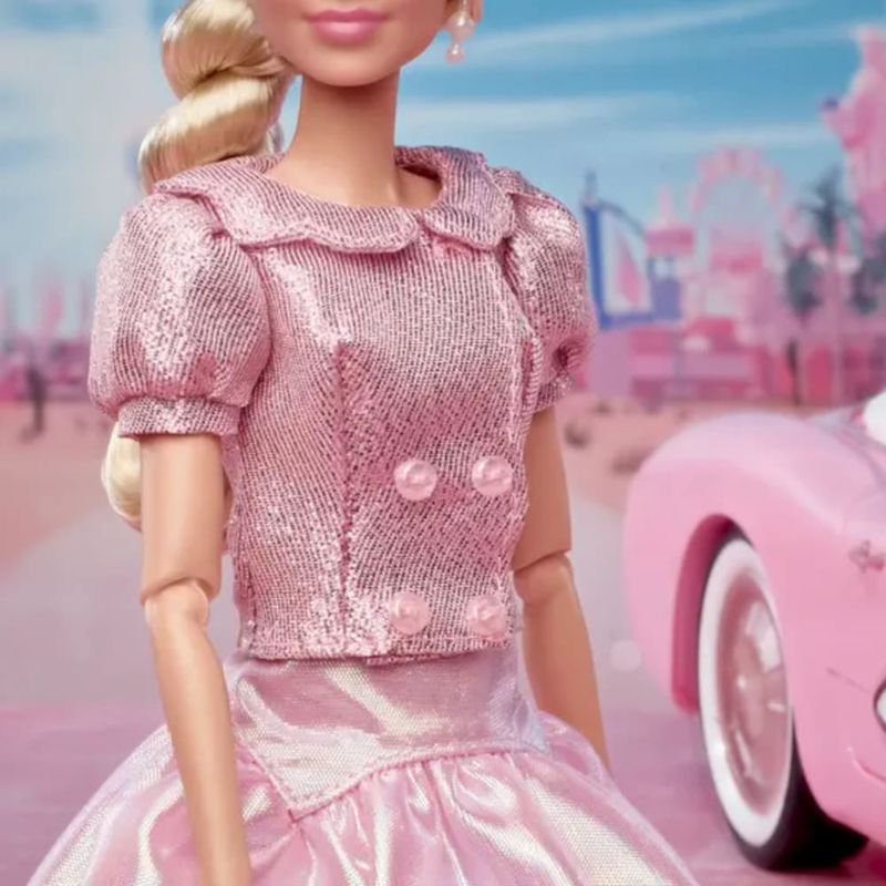 • Encante se com a elegância e o charme da Barbie The Movie, inspirada na icônica personagem interpretada por Margot Robbie no sucesso dos cinemas. Vestida com um look clássico e totalmente rosa, essa boneca colecionável traz todos os detalhes que marcaram o visual inesquecível de Barbie em seu passeio por Barbie Land.