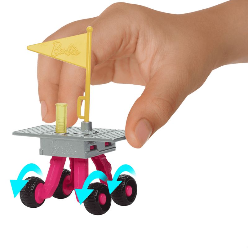 • Em comemoração ao 65º aniversário da boneca Barbie, uma coleção de bonecas fashion destaca as profissões favoritas dos fãs, como este conjunto de astronauta. A boneca Barbie usa um traje espacial com toques icônicos em rosa e vem com 10 acessórios temáticos, incluindo um capacete que altera a visão e um veículo espacial rolante!