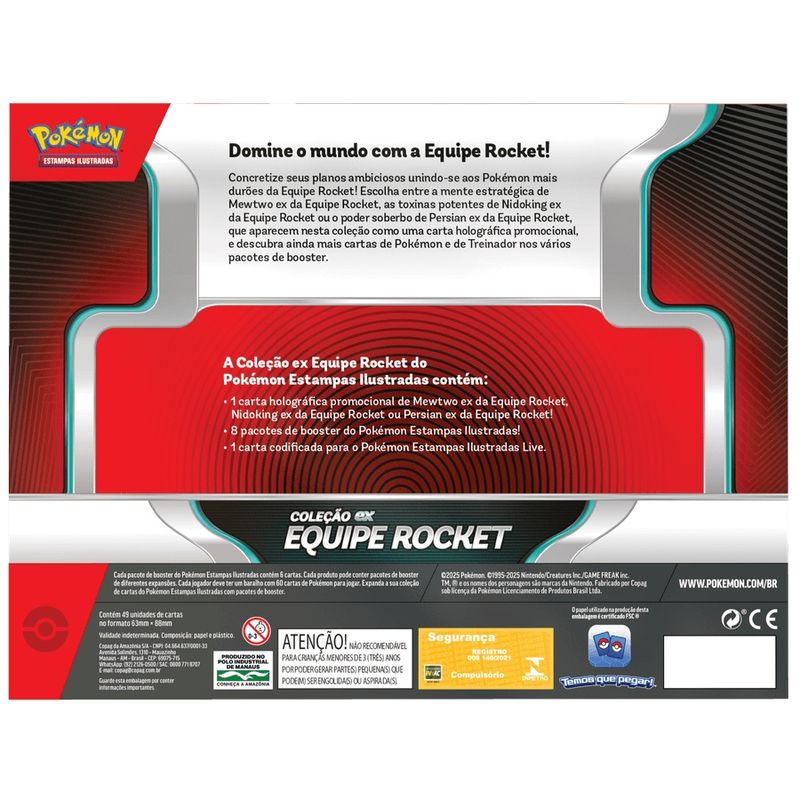 • Concretize seus planos ambiciosos unindo-se aos Pokémon mais durões da Equipe Rocket! Escolha entre a mente estratégica de Mewtwo Ex da Equipe Rocket, as toxinas potentes de Nidoking Ex da Equipe Rocket ou o poder soberbo de Persian Ex da Equipe Rocket, que apareceme nesta coleção como uma carta holográfica promocional, e descubra ainda mais cartas de Pokémon e de Treinador nos vários pacotes de booster.