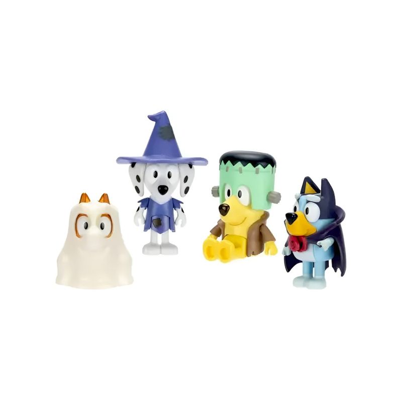 • Traga a magia do Halloween para a brincadeira com o Kit de 04 Bonecos Colecionáveis 6cm Bluey - Halloween! Este pacote especial inclui Bluey, Bingo, Chloe e Lucky, cada um vestido com fantasias temáticas para uma aventura de Halloween cheia de diversão. Bluey está vestida de vampira, Bingo em um traje de fantasma, Chloe como uma bruxa e Lucky como um engraçado Frankenstein, capturando o espírito festivo da temporada.