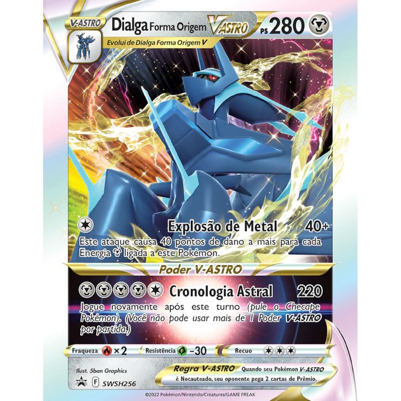 • Dialga Forma Origem V-Astro empunha um poder colossal capaz de distorcer o tempo conforme sua vontade e garantir vantagem em batalha! Em uma versão jogável e outra extragrande, este Pokémon Lendário ancestral carrega um poder V-Astro que permite a você jogar dois turnos seguidos. Jogue como gente grande com a ajuda de Dialga Forma Origem V e de outras cartas que encontrará nos pacotes de booster do Pokémon Estampas Ilustradas.