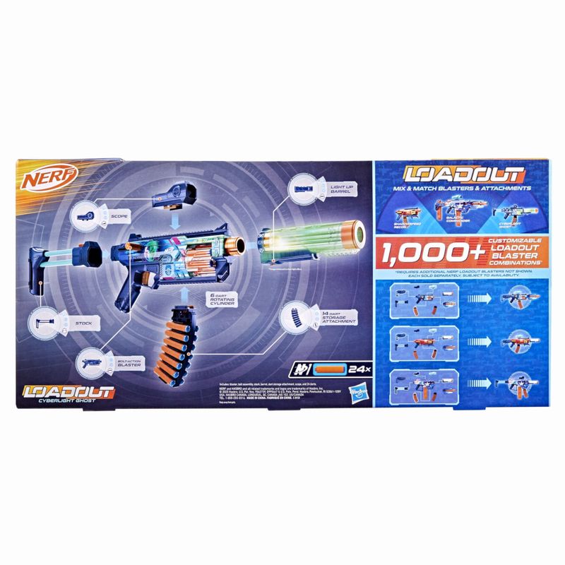 • O lançador Nerf Loadout Cyberlight Ghost permite ampla personalização com acessórios intercambiáveis. Este lançador possui luzes LED embutidas que iluminam o cano e fazem o cilindro rotativo de 6 dardos brilhar. Ele vem com uma mira, coronha, cano e um acessório de armazenamento de dardos. O conjunto inclui 24 dardos de espuma Nerf N1.