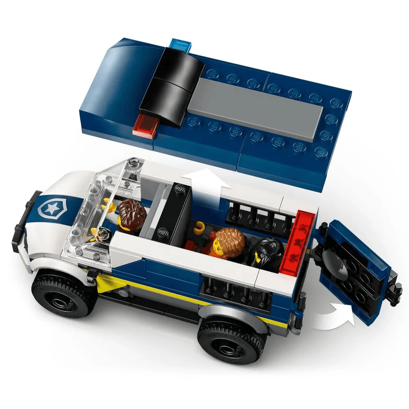 • Conjunto Lego City Van de Transporte de Prisioneiros da Polícia para crianças a partir de 06 anos, com minifiguras de policial e 02 prisioneiros para brincadeiras de ação. Inclui caminhão policial com cela integrada e motocicleta de fuga, permitindo prender os bandidos e realizar fugas usando o gancho da moto. Ótima ideia de presente para crianças que gostam de brinquedos de polícia, brincadeiras práticas e histórias criativas, podendo ser combinado com outros conjuntos Lego City.